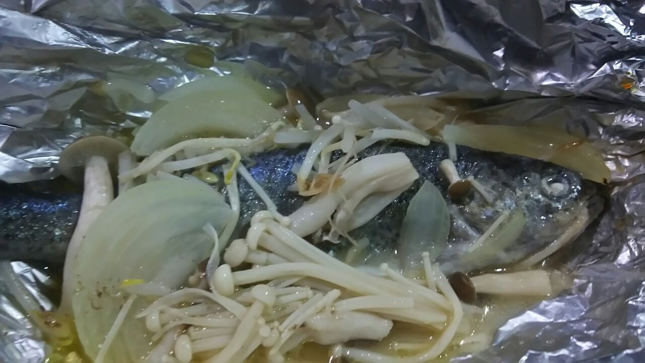 さて、僕も天川くんもそれぞれ1匹ずつ無事に釣ることができ、マスの調理に取り掛かります。今回は「マスのホイル蒸し」。アルミホイルにマスや玉ねぎ、各種キノコを乗せて包んで焼くだけ。超簡単なのに超おいしい。