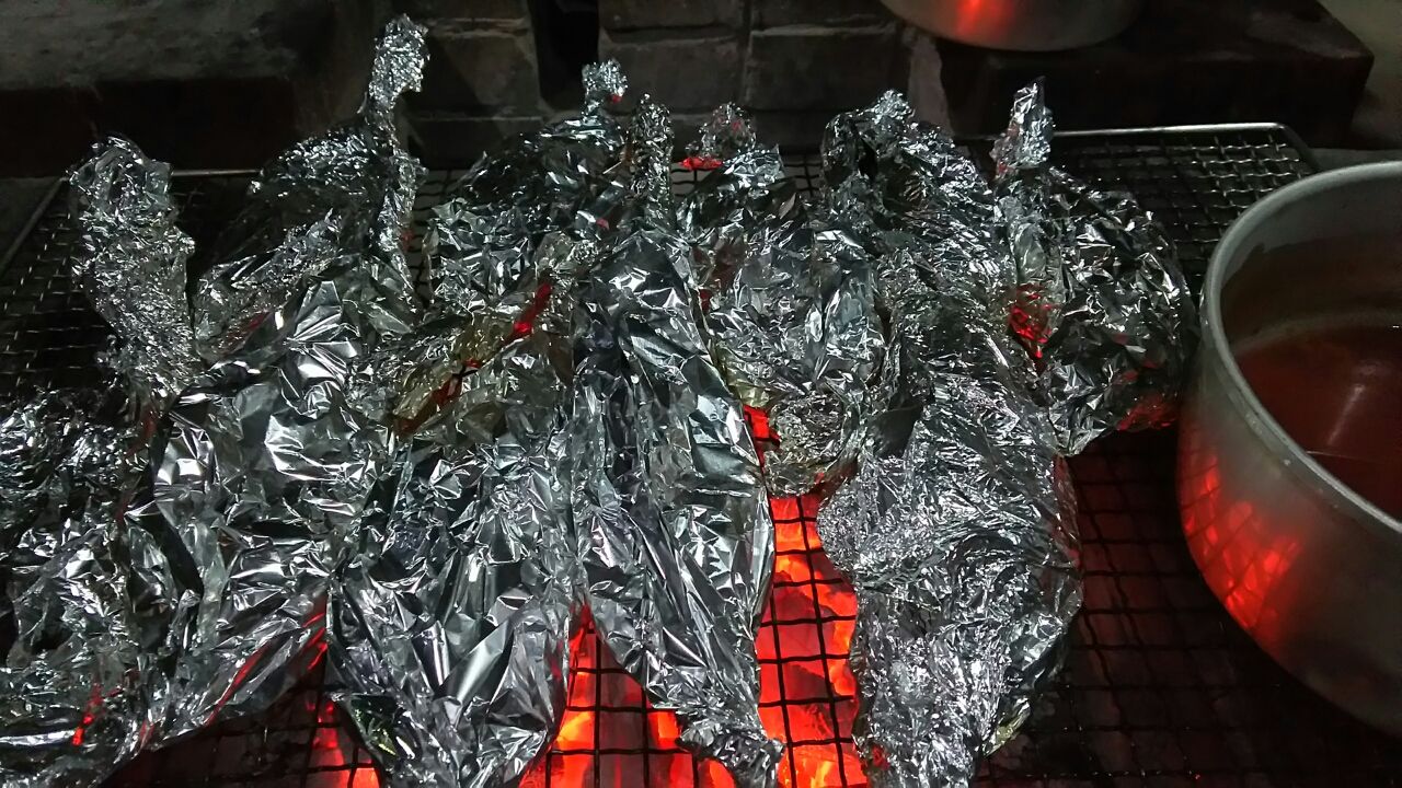 続いて、マスの登場です。こちら、網の上で20分~30分置いておくとあら不思議、骨まで食べられる「マスのホイル蒸し」の完成です。これね、6人でこんなにも食べられるんかなとか思っていたけれど、だって美味しいんだもん。食べちゃった。レモンの変わりにカボスをかけてね。いいでしょ?
