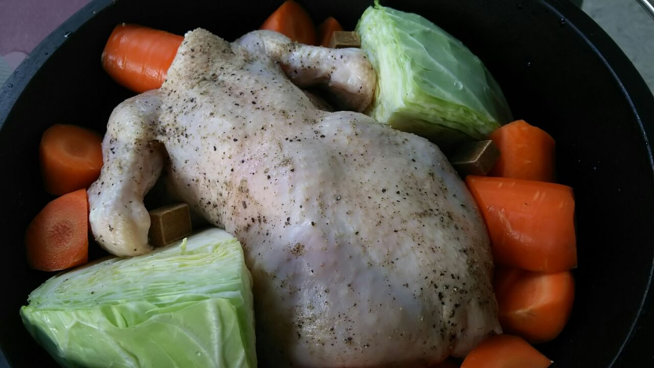 1.8Kgの丸鶏どーんとダッチオーブンに突っ込んで、ポトフをつくります。